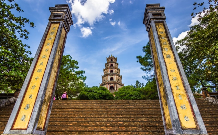 Next, head to Thien Mu Pagoda, Hue’s most iconic spiritual landmark, perched on a hill overlooking the Perfume River. This serene seven-story pagoda holds deep historical and cultural significance.